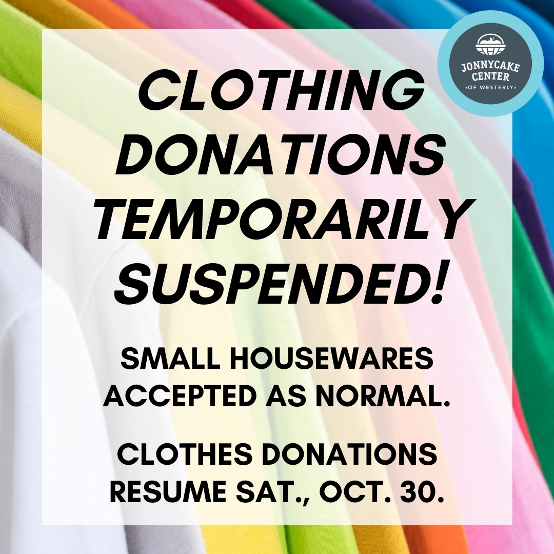 We accept donations of clothing shoes accessories artwork and housewares for our thrift store. The Jonnycake Center of Westerly tax exempt ID is 05-0367687. In our efforts to make this year better for those who are struggling to make ends meet we are asking for help with some items that are high on the FallWinter need list at the Jonnycake Center.